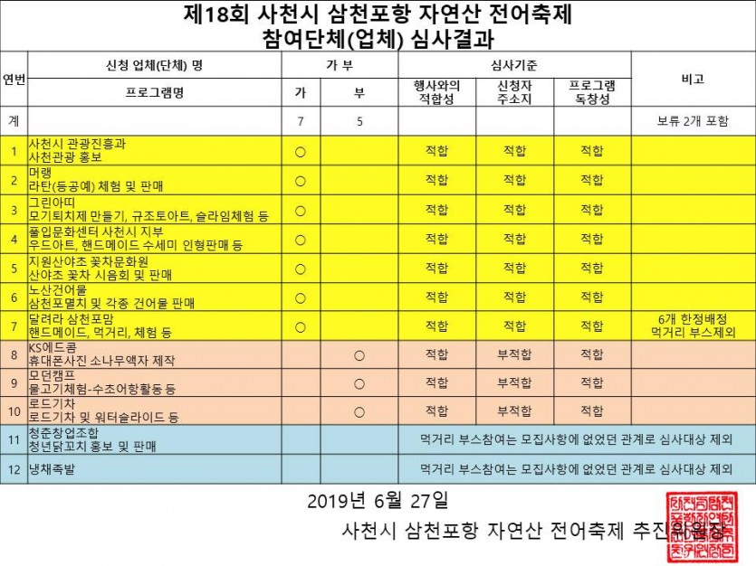 제18회 사천시 삼천포항 자연산 전어축제 참여단체(업체) 심사결과 페이지 정보 작성자 관… 작성일19-06-27 10:42 조회4,649회 관련링크 이전글 다음글 목록 본문 참여단체(업체)에 선정되신 분들께는 사무국에서 별도 연락을 드리도록 하겠습니다. 이전글 다음글 목록